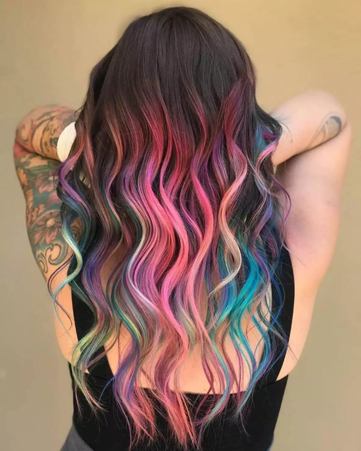 Rainbow hair adalah tren yang kreatif dan eksentrik. Tren ini melibatkan pewarnaan rambut dengan berbagai warna pelangi, menciptakan tampilan yang cerah dan mencolok juga berani.