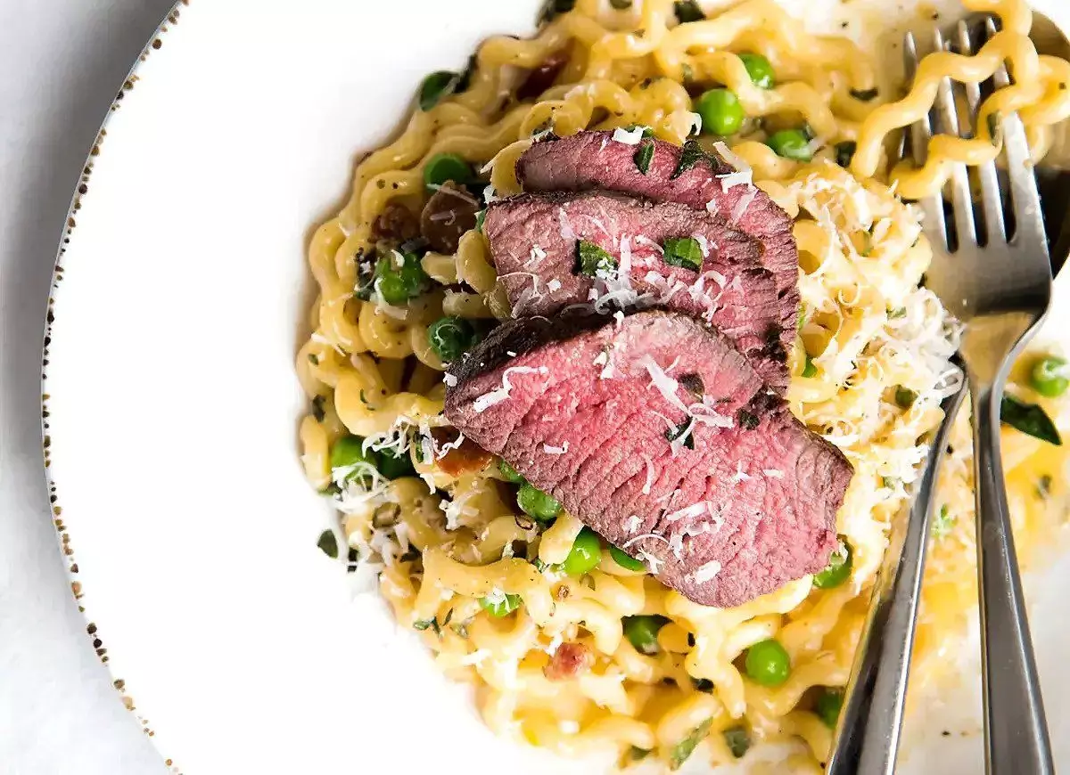 - Campurkan pasta dengan bacon sapi dan saus. lalu, sajikan dan taburi dengan keju parmesan.