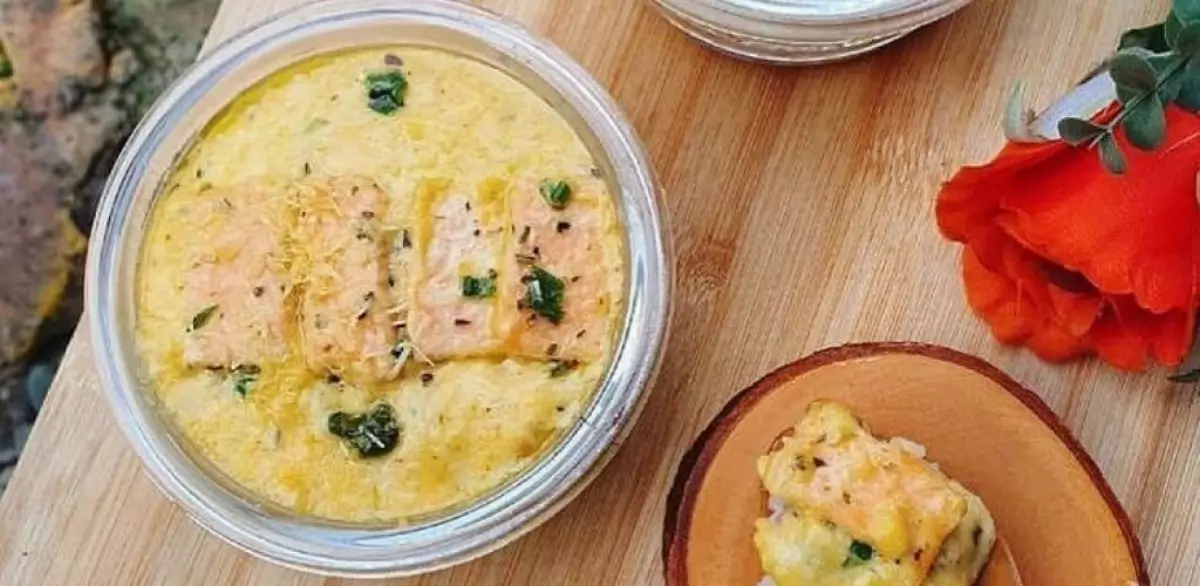Kombinasi telur kukus dengan salmon panggang menciptakan hidangan sarapan yang lezat dan kaya asam lemak omega-3.