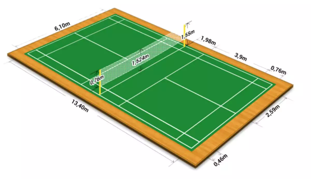 Bulu tangkis dimainkan di lapangan berukuran 13,4 meter x 5,18 meter untuk tunggal dan 13,4 meter x 6,1 meter untuk ganda. Permainan dimainkan dengan raket dan shuttlecock.