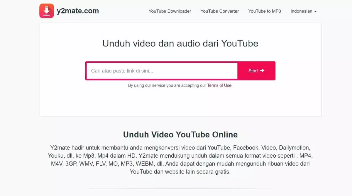 Situs web pertama yang bisa kamu gunakan untuk mengkonversi video YouTube menjadi MP3 adalah Y2Mate. Kamu bisa menjadikan situs ini sebagai salah satu alternatif untuk mendownload video YouTube yang tidak tersedia offline.