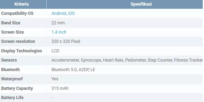 Smartwatch ini menawarkan kerangka kokoh dengan desain menawan dan telah mengantongi sertifikat IP68 yang menjadikan smartwatch ini tahan air. Dilengkapi layar 1.4 inci dan berbagai fitur lengkap yang siap untuk membantu pengguna beraktifitas. Harga untuk smartwatch ini adalah sekitar Rp.430.000an.