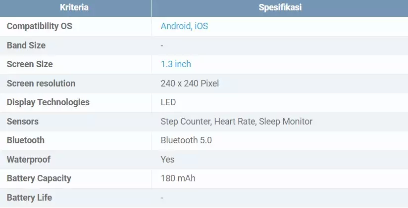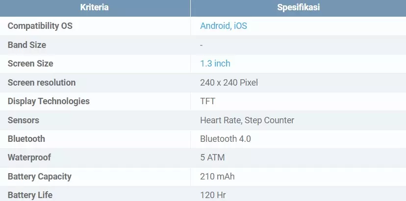 Smartwatch ini dilengkapi sistem operasi Nordic 52832 yang menopang performa smartwatch ini, dilengkapi dengan layar 1.3 inci dan sudah full touchscreen hingga tahan air IP67. Keunggulan yang dimiliki smartwatch ini adalah adanya penghitung langkah, monitor detak jantung dan tekanan darah, juga ada kontrol pemutar musik. Harga untuk smartwatch ini adalah sekitar Rp520.000 an.
