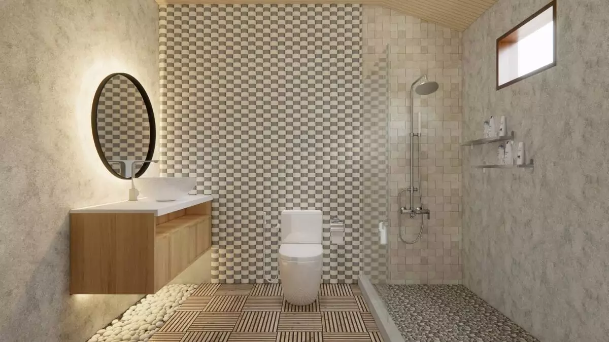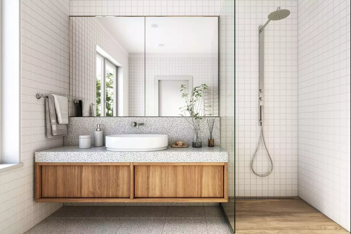 Hindari perlengkapan berlebihan dan pilihlah shower tanpa bak mandi, untuk memberikan kesan modern dan meminimalkan penggunaan ruang.