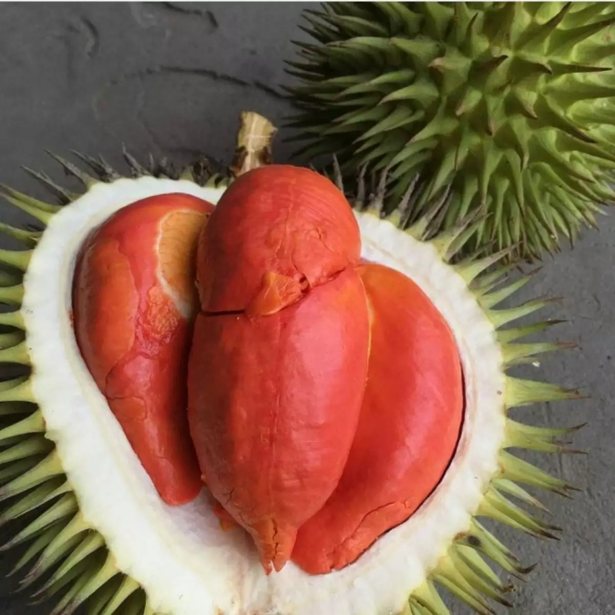 Daging buah durian merah sangat lembut namun tidak lembek. Sedangkan dari segi ukuran, durian merah sama dengan durian lainnya. Karena keunikan warna daging buahnya, durian merah sampai diimpor ke luar negeri, lho!