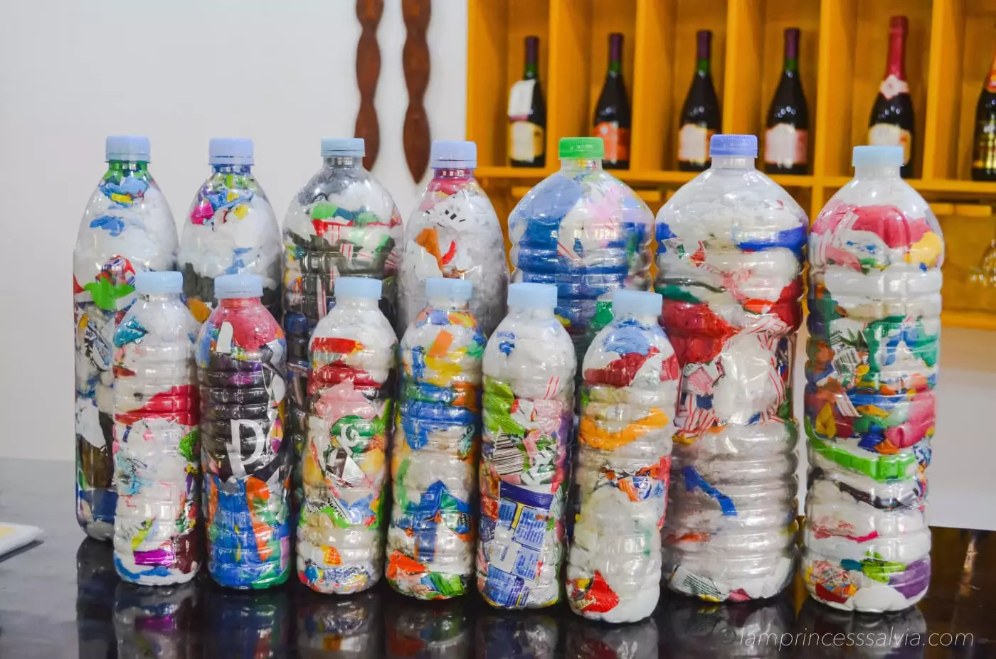 Setelah sampah dan botol kering, masukan sampah ke dalam botol bekas air mineral tadi hingga penuh. Kamu bebas memilih warna sampah plastik yang akan dimasukan ke dalam botol mineral, satu warna agar senada, boleh juga berbeda warna jika ingin hasil berbeda corak.