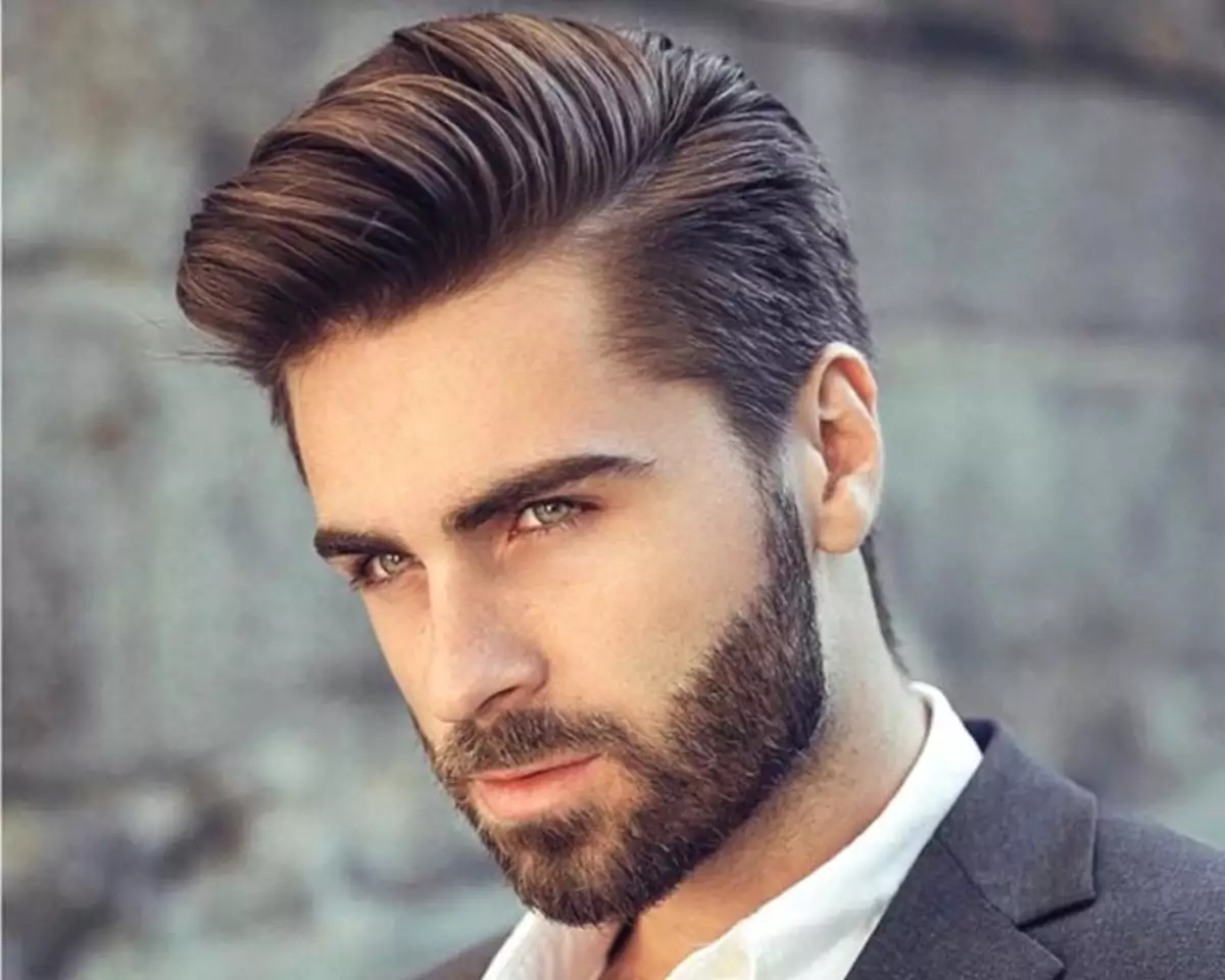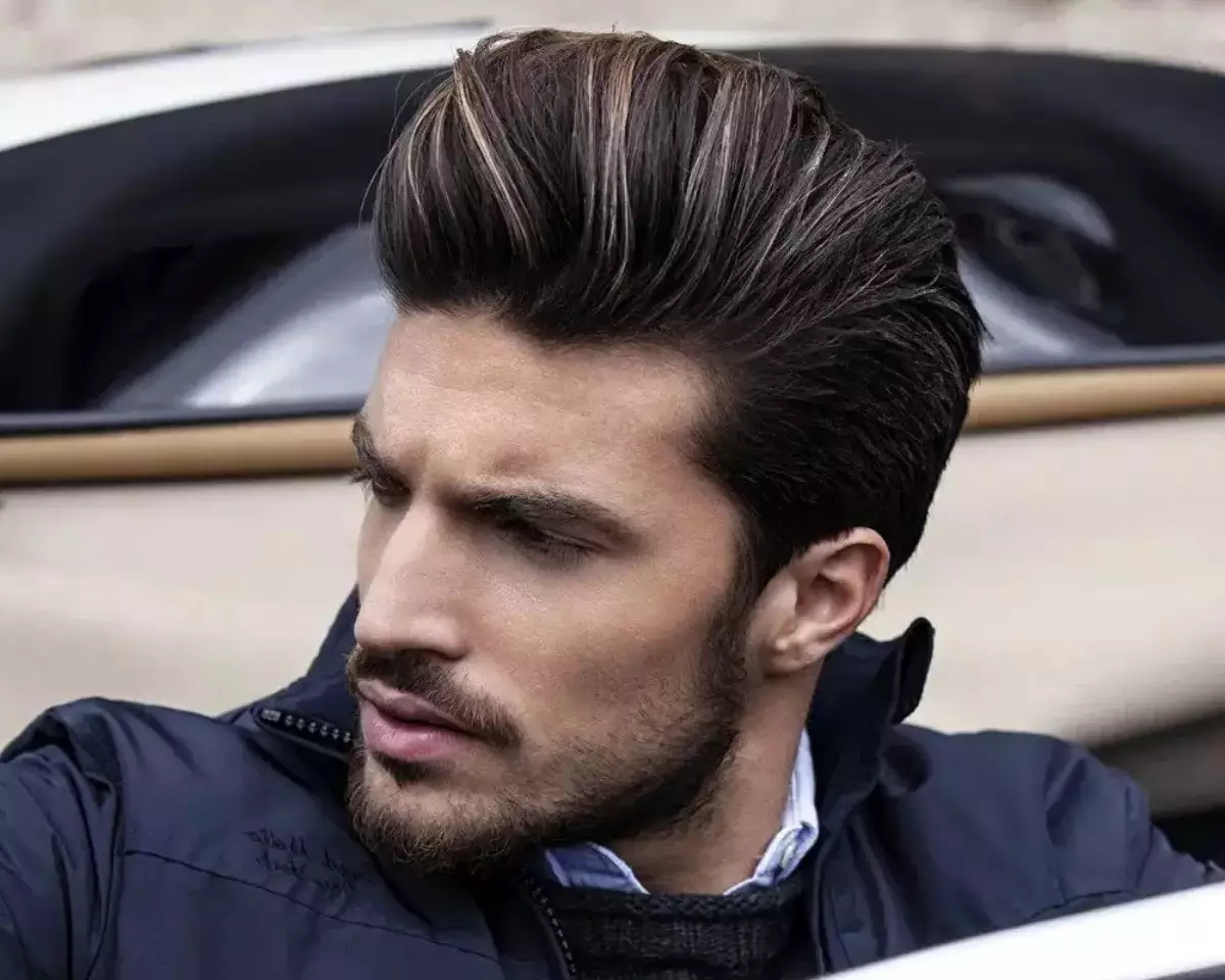 Rambut di bagian atas diberikan volume dengan gaya pompadour yang diatur ke arah samping, menghasilkan tampilan yang elegan dan klasik.
