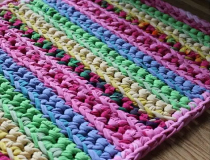 Anda dapat menggunting baju bekas Anda dengan warna yang beragam menjadi sebuah kain. Kain yang berwarna warni itu kemudian anyamlah dan sedikit jahit menjadi satu agar lebih kokoh.