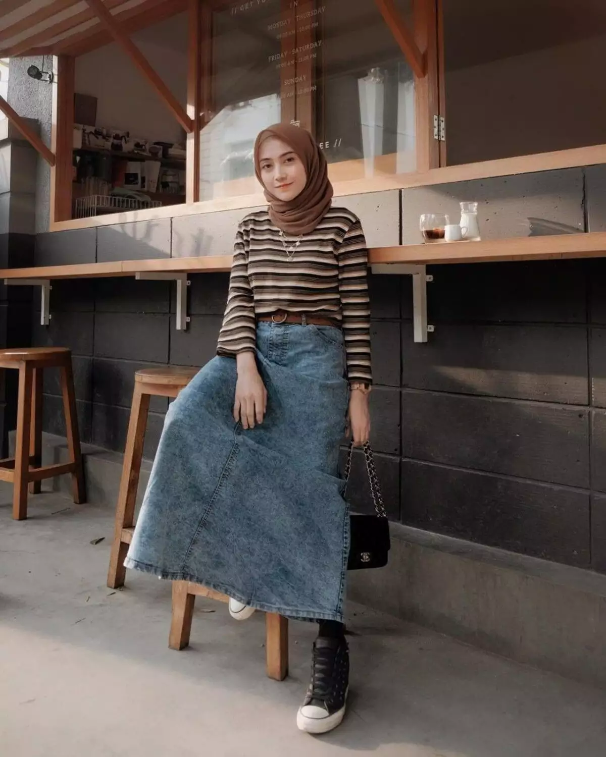 Sweater crop dan rok denim adalah paduan yang populer dalam gaya street style yang nyaman dan trendi.