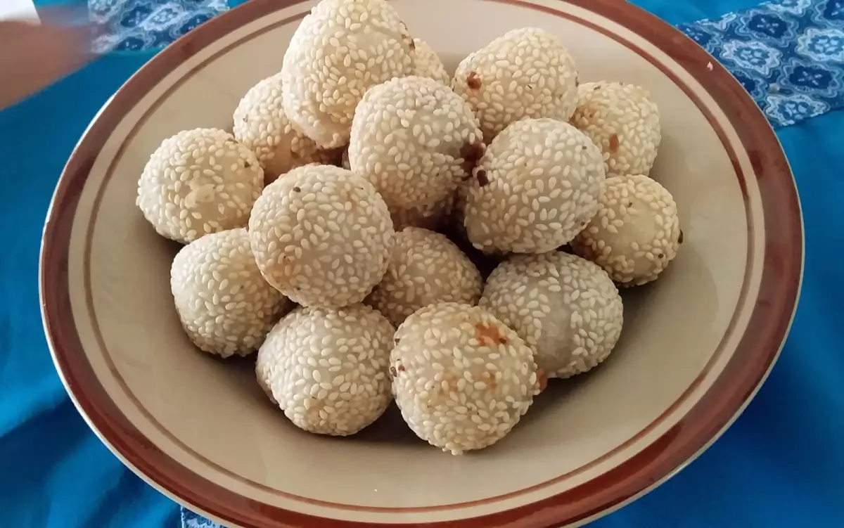 Makanan berbentuk bulat yang berbahan dasar dari tepung ketan dan tepung terigu. Lalu di isi kacang hijau yang sudah dihaluskan.