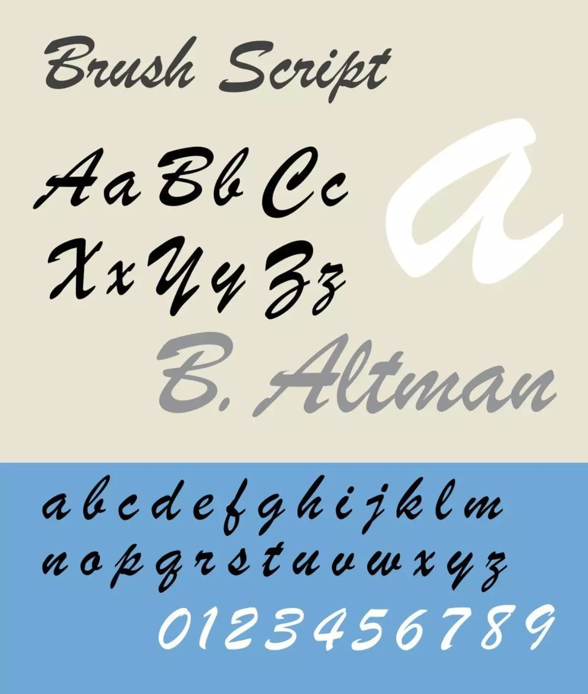 Brush Script adalah font script yang menyerupai tulisan tangan dengan kuas. Font ini memiliki bentuk huruf yang artistik dan ekspresif, dengan variasi tebal tipis garis huruf .