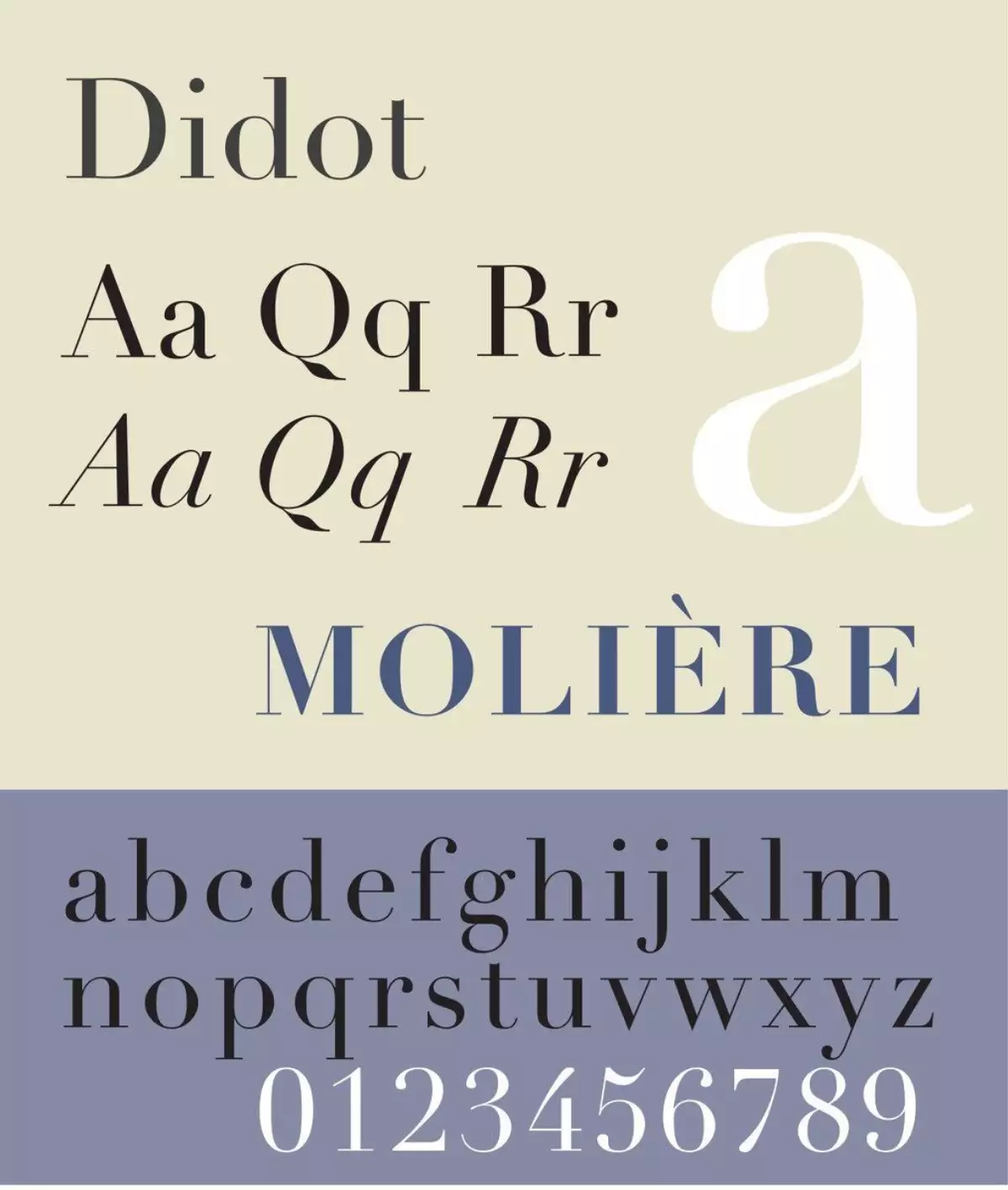 Didot adalah font serif yang memiliki gaya mewah dan glamor. Font ini dibuat oleh seorang pencetak Prancis bernama Firmin Didot pada abad ke-18. Font ini memiliki ujung huruf yang tipis dan tajam, dan lekukan huruf yang dramatis.