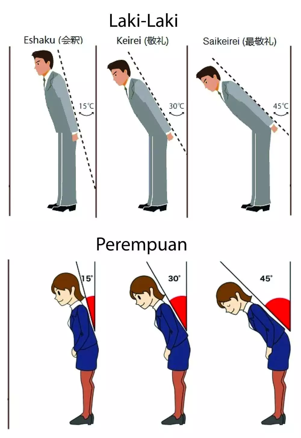 Ucapan salam seperti ohayou gozaimasu ‘selamat pagi’, konnichi wa ‘selamat siang’, konban wa ‘selamat malam’ diucapkan dengan posisi badan menunduk sekitar 15ᵒ. Ketika mengucapkan terima kasih (arigatou gozaimasu) secara verbal akan disertai dengan menundukkan badan sekitar 30ᵒ.