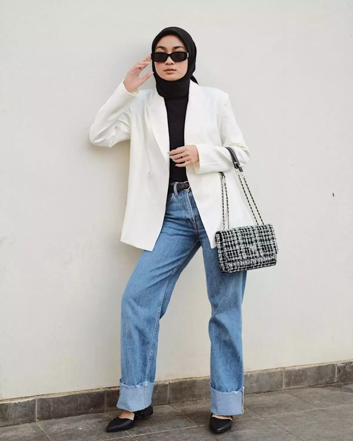Gaya klasik ini tidak pernah salah untuk outfit kuliah kamu. Blazer putih akan memberikan kesan bersih dan sopan, sedangkan jeans akan memberikan kesan santai dan keren.