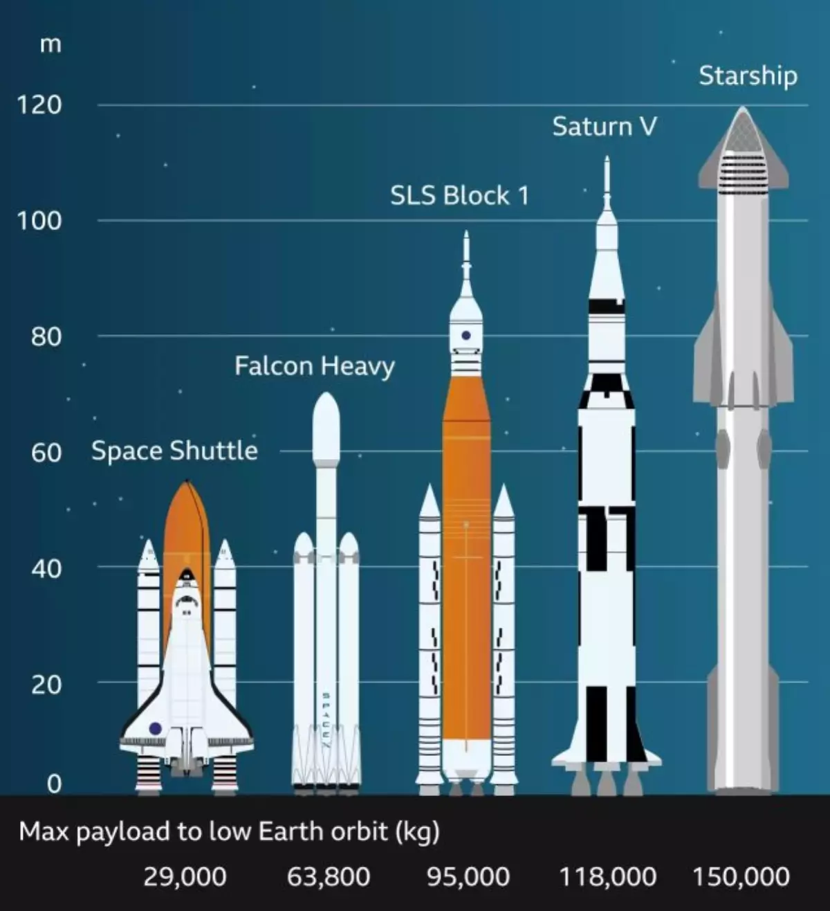 Pesawat ruang angkasa, yang disebut Starship, akan berada di atas roket yang disebut Super Heavy. Sistem gabungan ini akan memiliki tinggi 120 m (394 kaki) dan juga disebut sebagai Starship.