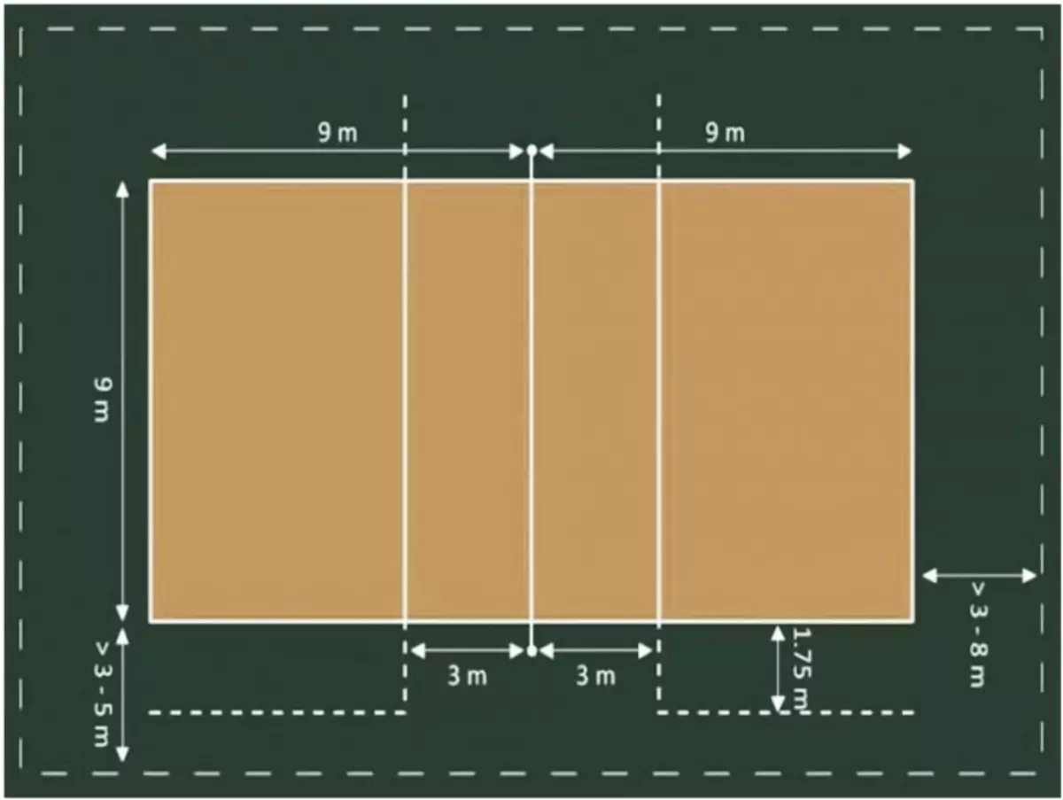 Garis tengah panjang membuat dua lapangan yang identik berukuran 9 meter x 9 meter.