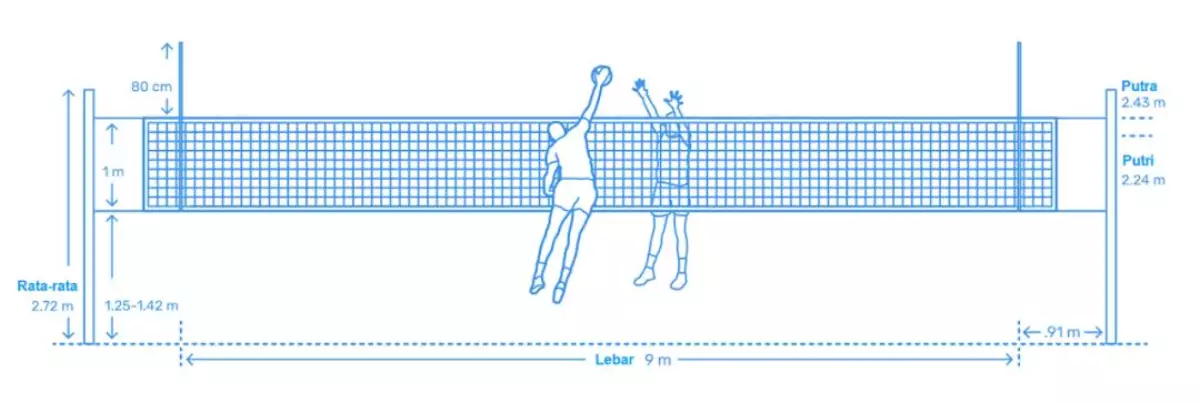 Net yang digunakan dalam permainan bola voli terbuat dari serat sintetis dengan lebar 1 meter dan panjang 9,5 meter.
