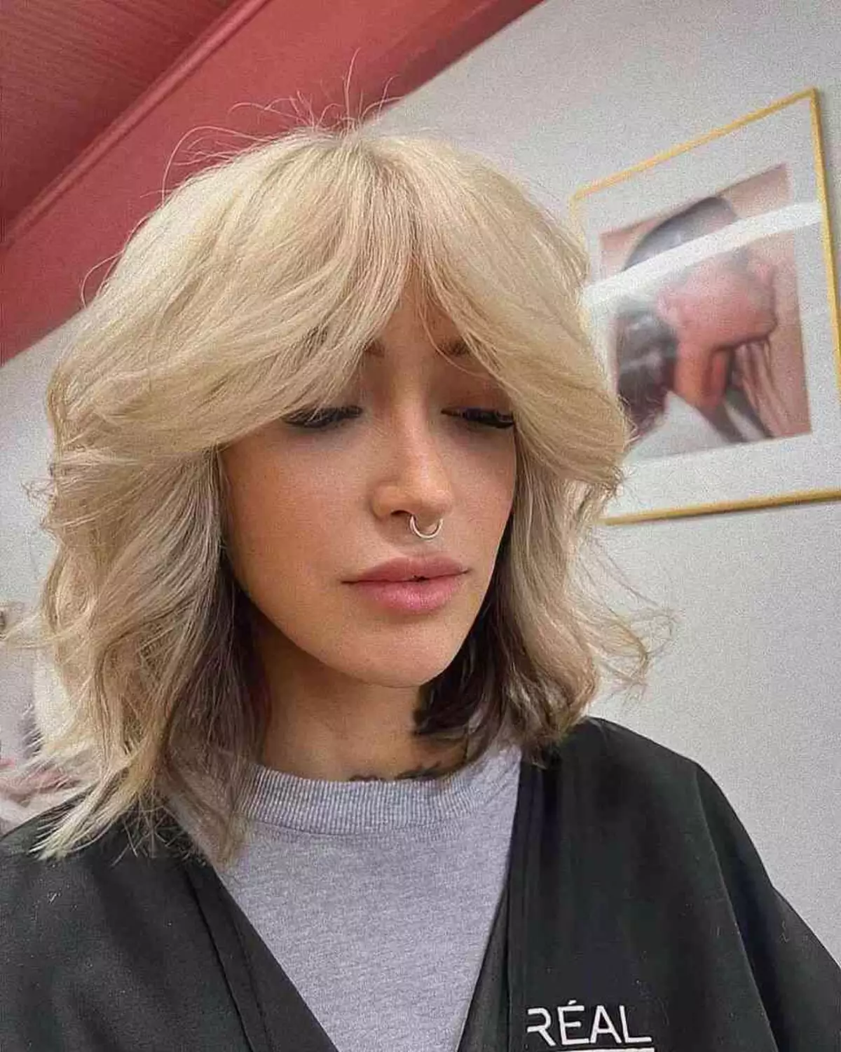 Layered medium shag with bangs adalah model rambut shaggy sebahu yang memiliki potongan berlapis-lapis atau layer dengan poni di depan.