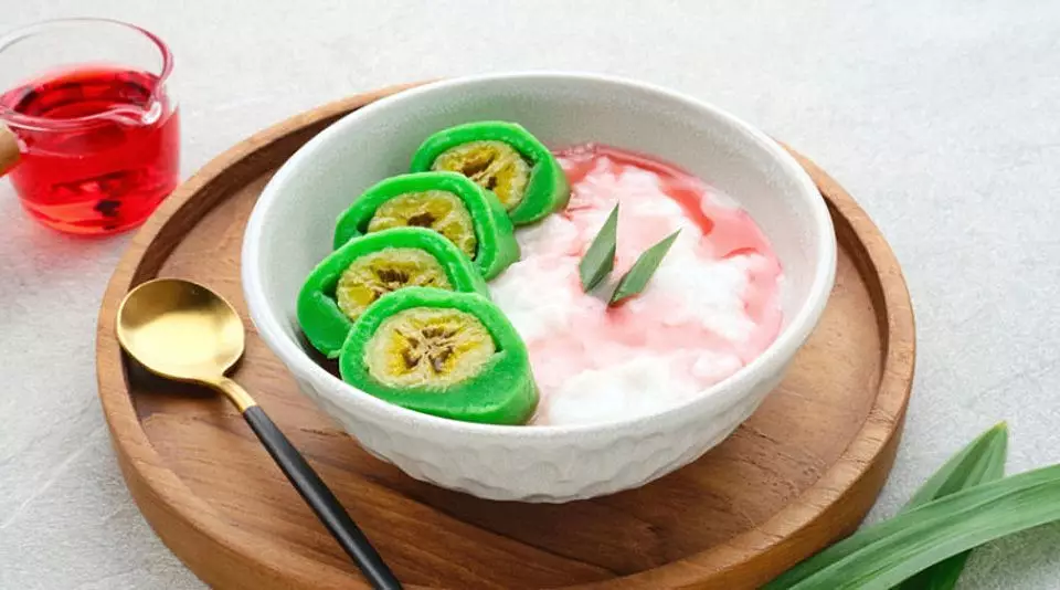Dan yang terakhir, potong-potong adonan yang telah dikukus dan sajikan dengan sirup, es, susu kental manis, dan saus yang terbuat dari campuran santan, terigu, daun pandan, gula pasir yang dimasak hingga kental.