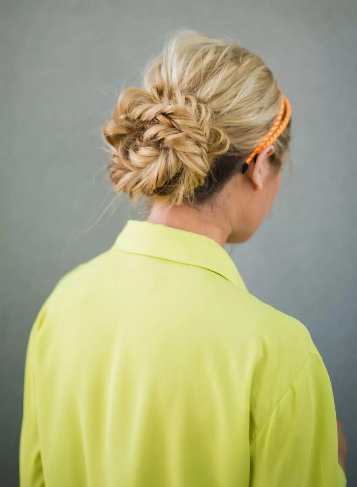 Setelah Anda membuat rambut kepang fishtail, gulung kepangan menjadi bentuk bun yang elegan. Tambahkan beberapa bobby pins untuk menjaga bentuk bun tetap aman.