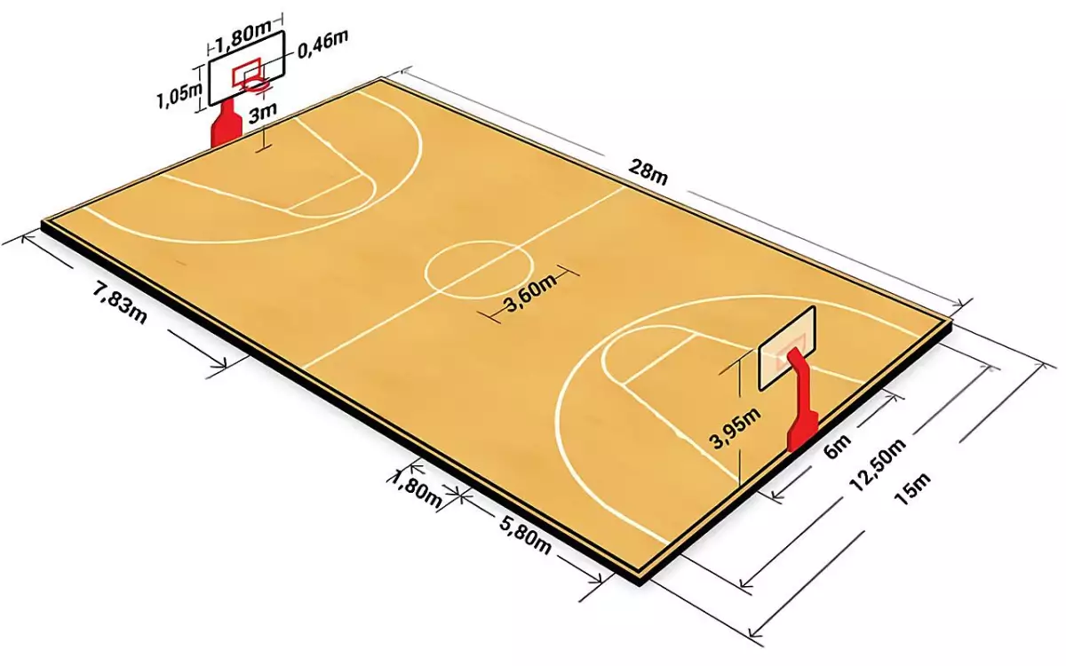 Lapangan bola basket berukuran panjang: 28 meter, lebar: 15 meter, Diameter lingkaran tengah: 3,6 meter, Jarak garis tiga poin ke ring: 6,75 meter, dan Jarak garis busur ring basket: 1,25 meter. Sementara untuk tinggi ringnya 3,05 meter, dengan diameter ring : 45cm.